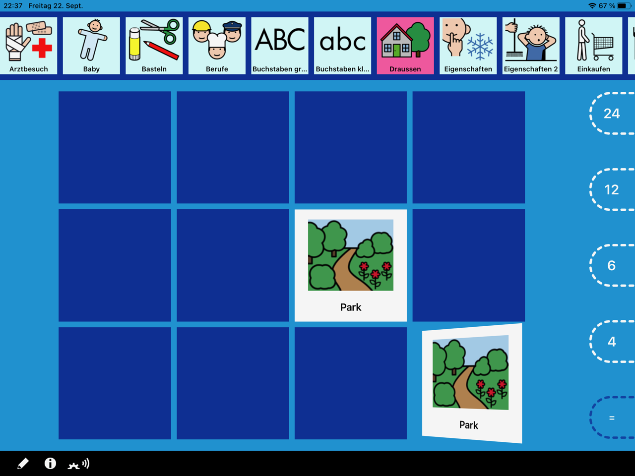 Durch Aufdecken der Karten sollen Paare gefunden werden. Wird ein Paar gefunden, spricht die App den Kartentext. Nach erfolgreich gemeistertem Spiel erscheinen unter Applaus noch einmal alle Karten. So kann man sie sich in Ruhe ansehen und durch Antippen vorlesen lassen.